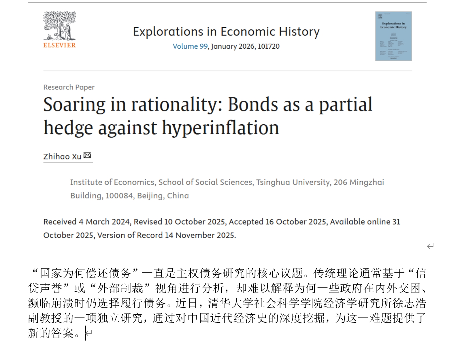 近日,该研究成果以“Soaring in rationality: Bonds as a partial hedge against hyperinflation”为题,发表于Explorations in Economic History(该刊为经济史领域国际顶级期刊之一)。徐志浩副教授为论文独立作者,其主要研究方向为战争等极端环境下的经济行为与政治互动,该研究是其在民国恶性通货膨胀系列研究中的成果之一。
