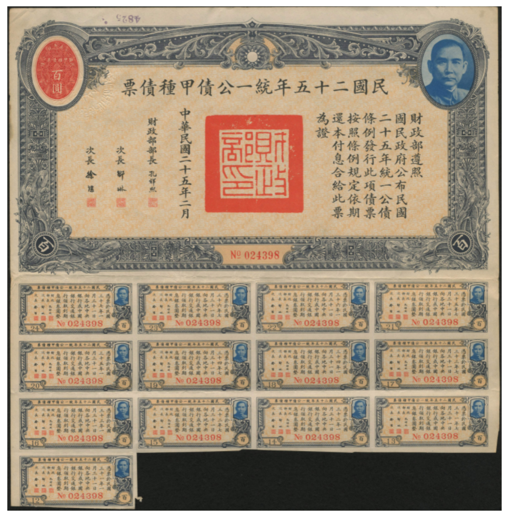 民国二十五统一公债债票和息票示例